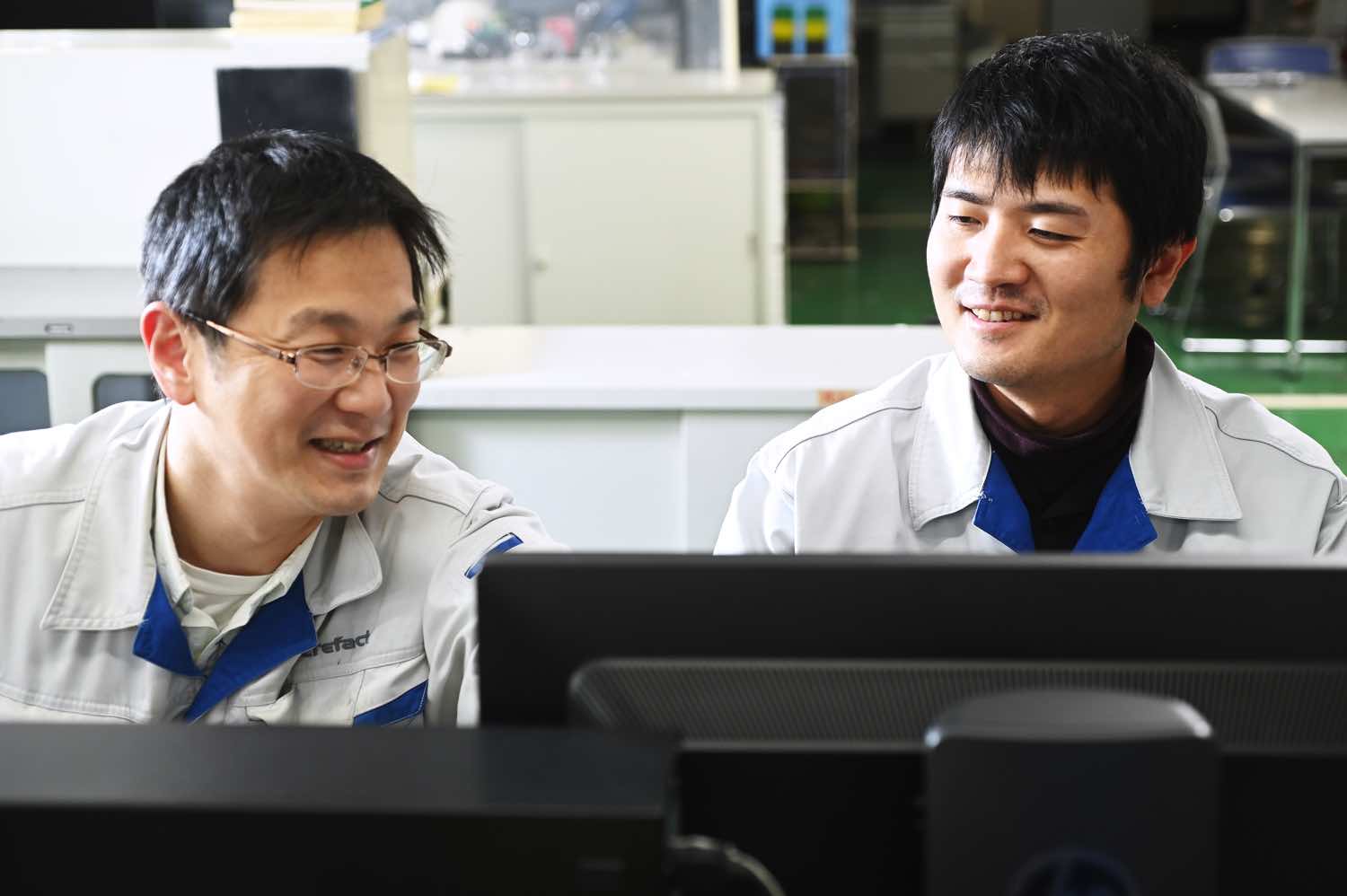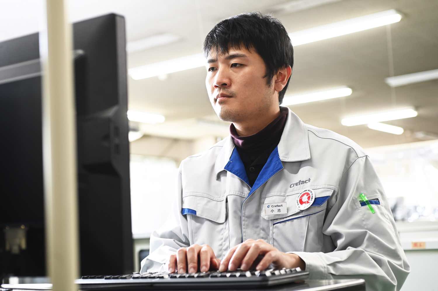 私が現在所属している部署は「生産技術部板金技術課」といい、プレス機を使用し、板材から製品を生み出す最初の工程になります。「技術」という名の通り、プレス機や金型の仕組みを理解して工程を考えて段取りをしたり、立ち上がりに必要な費用の見積もりなどが主な私の仕事内容です。また、PCを使いCADを使用して図面を書いたりする事もあるので、CADが得意な方には、より一層活躍することが出来ると思います。仕事の種類も豊富で様々な事に挑戦でき、自分のペースで進めていくことが出来ます。まだまだ入社して間もないので様々な事でつまずく事もあります。しかし先輩方を初め、自分の質問に的確に答えて下さるので仕事が「分からないまま」という心配はありません。一人で分からなければ皆で考える。それがクレファクトの良い所で強みでもあります。